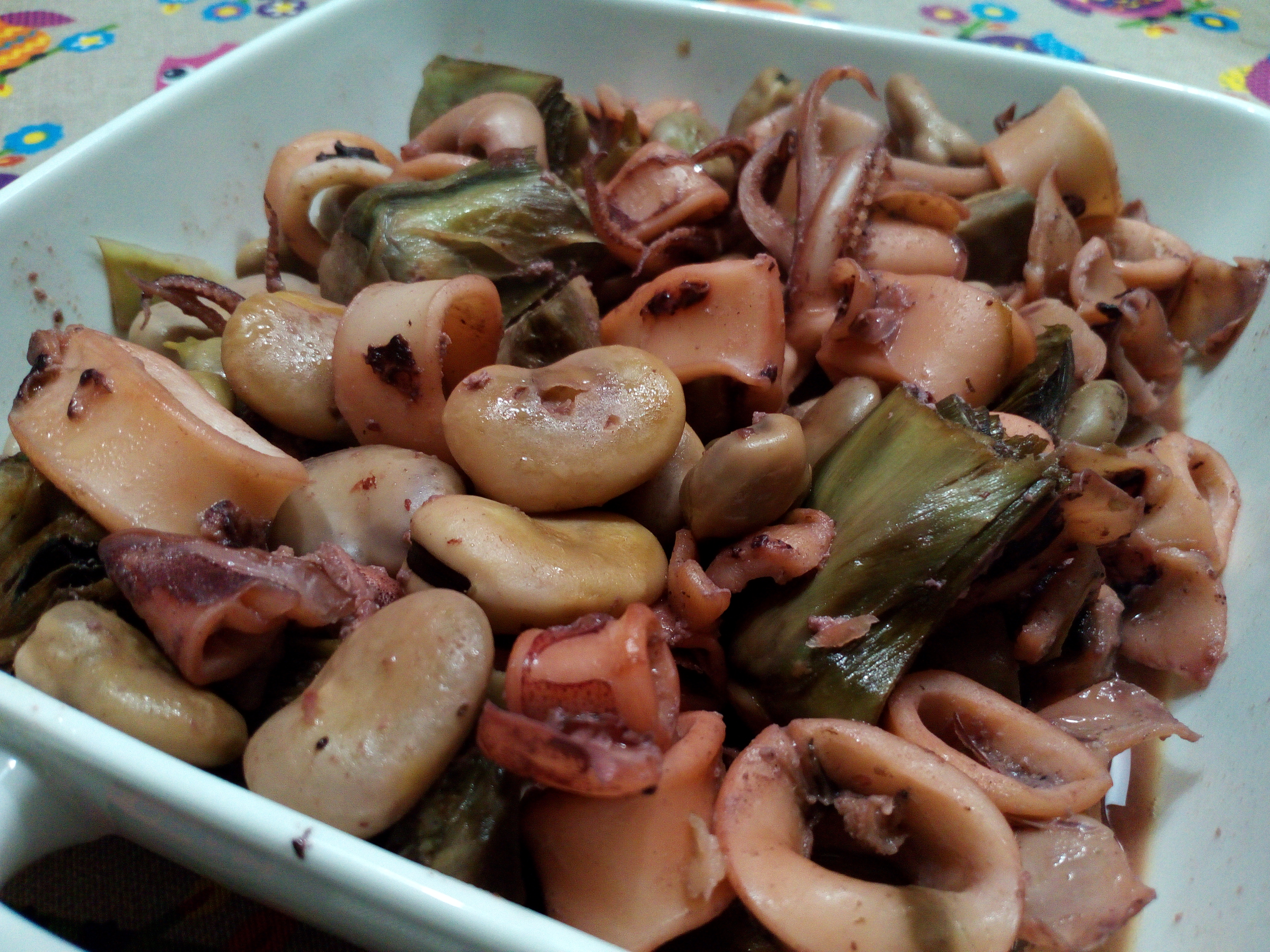 - Pelamos las alcachofas y las cortamos en cuartos. Cortamos los calamares en trozos.