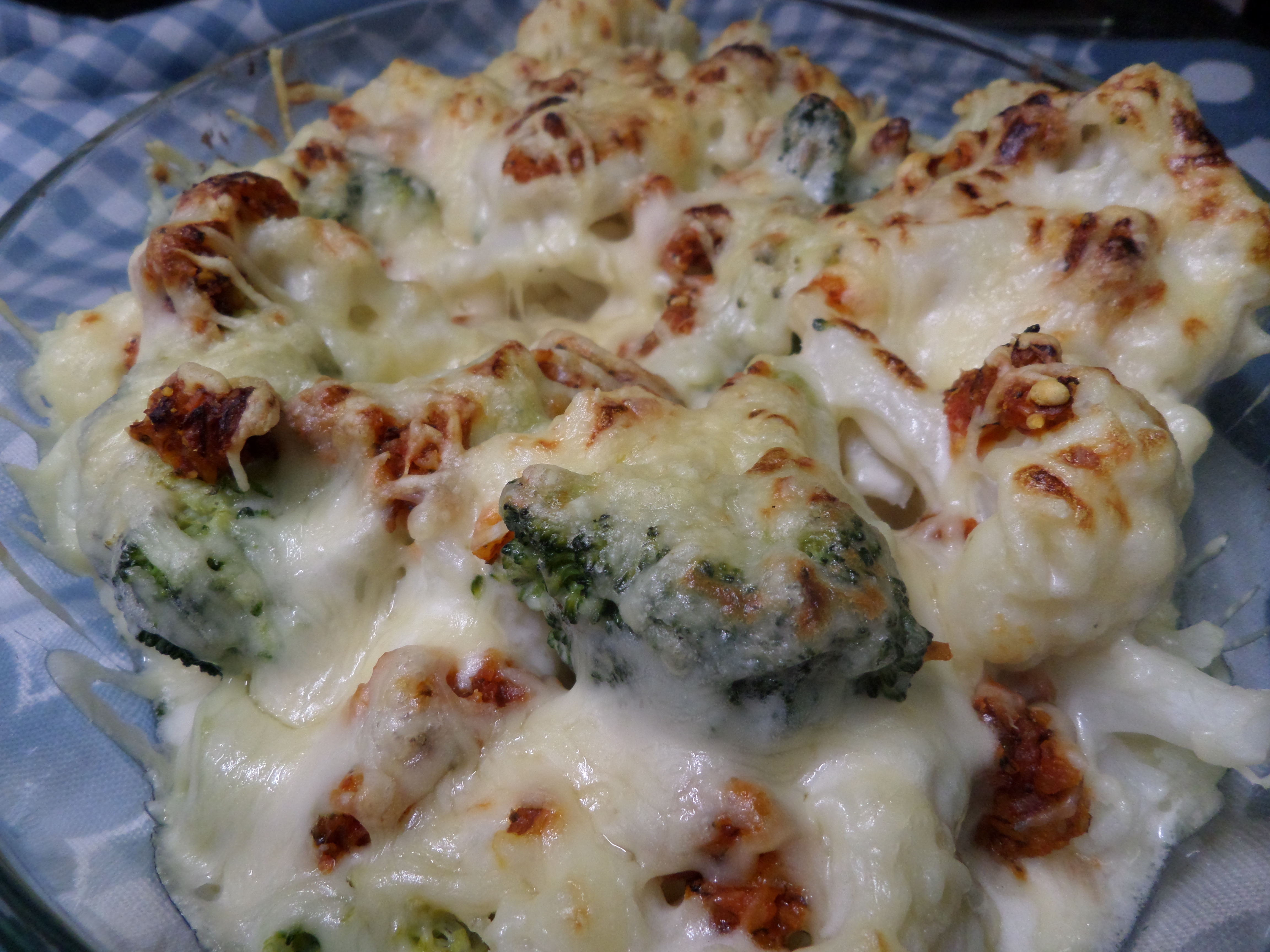 - Escurrimos la coliflor y el brócoli y ponemos en una fuente apta para horno. Repartimos la bechamel por encima y espolvoreamos queso rallado.