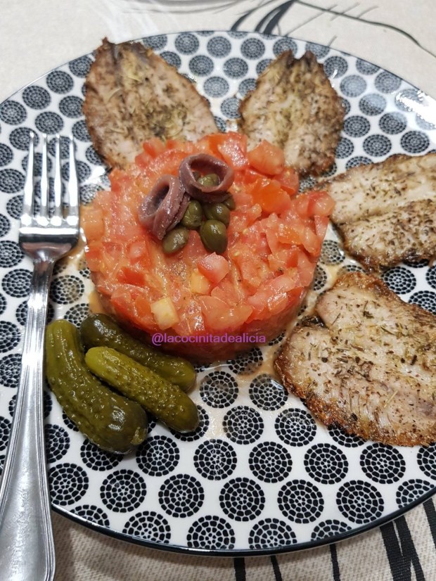 - Para hacer una presentación más bonita, ponemos un aro de emplatar en el plato donde vayamos a servirlo y añadimos el tartar de tomate, de forma que quede compacto y retiramos el aro. Le ponemos por encima unas alcaparras, unas anchoas y un chorrito de aceite.