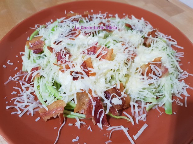 Esta carbonara es un poco diferente por todos los ingredientes que lleva. Primero en lugar de pasta vamos a hacer espaguettis de calabacin. En segundo lugar la salsa no la vamos a hacer con los ingredientes habituales de la carbonara. En cualquier caso en casa nos encantó.