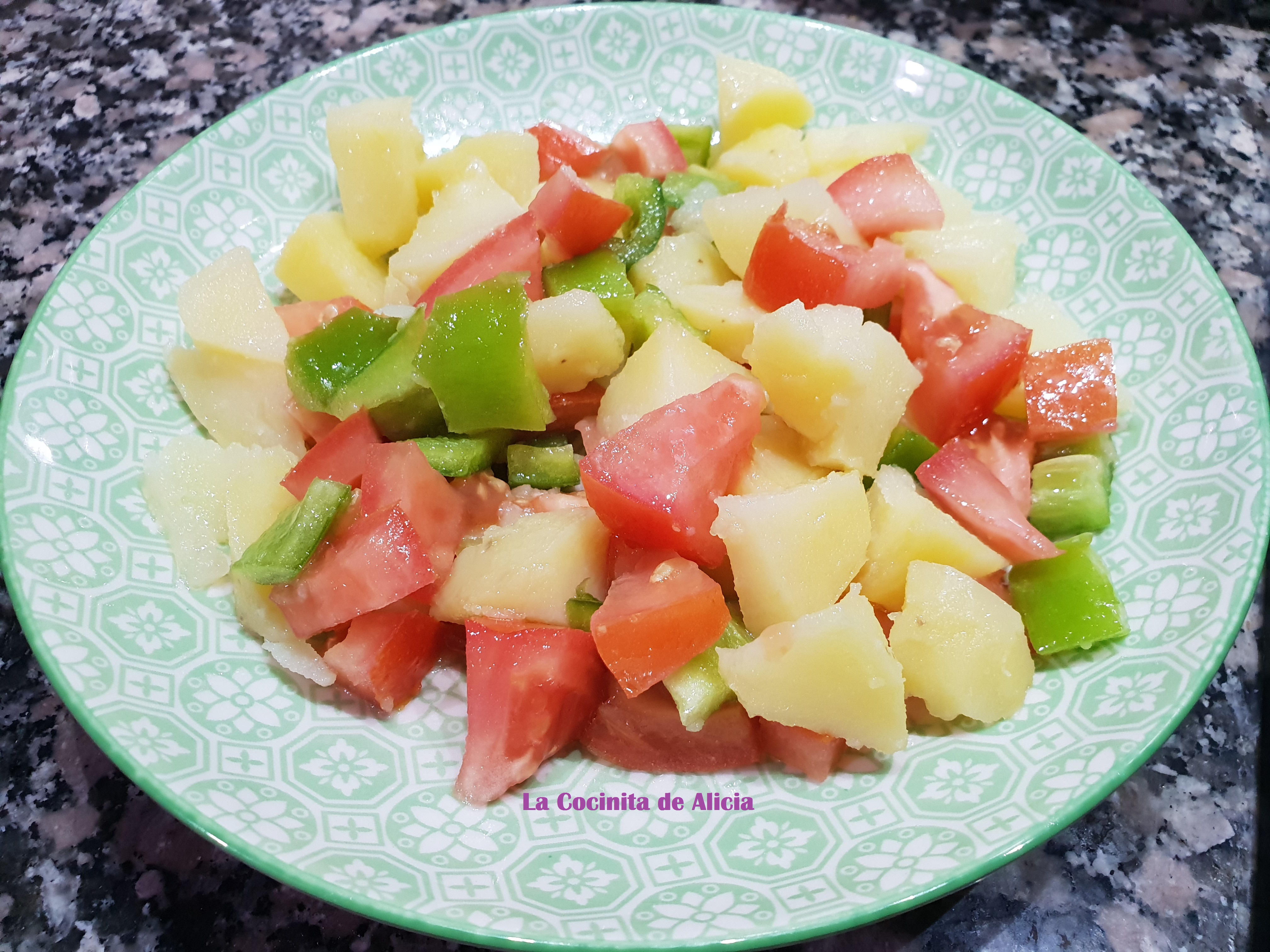 - Mezclamos las patatas, con el pimiento y los tomates, ponemos sal, aceite y un chorrito de vinagre. Lo mezclamos todo bien y a comer!!